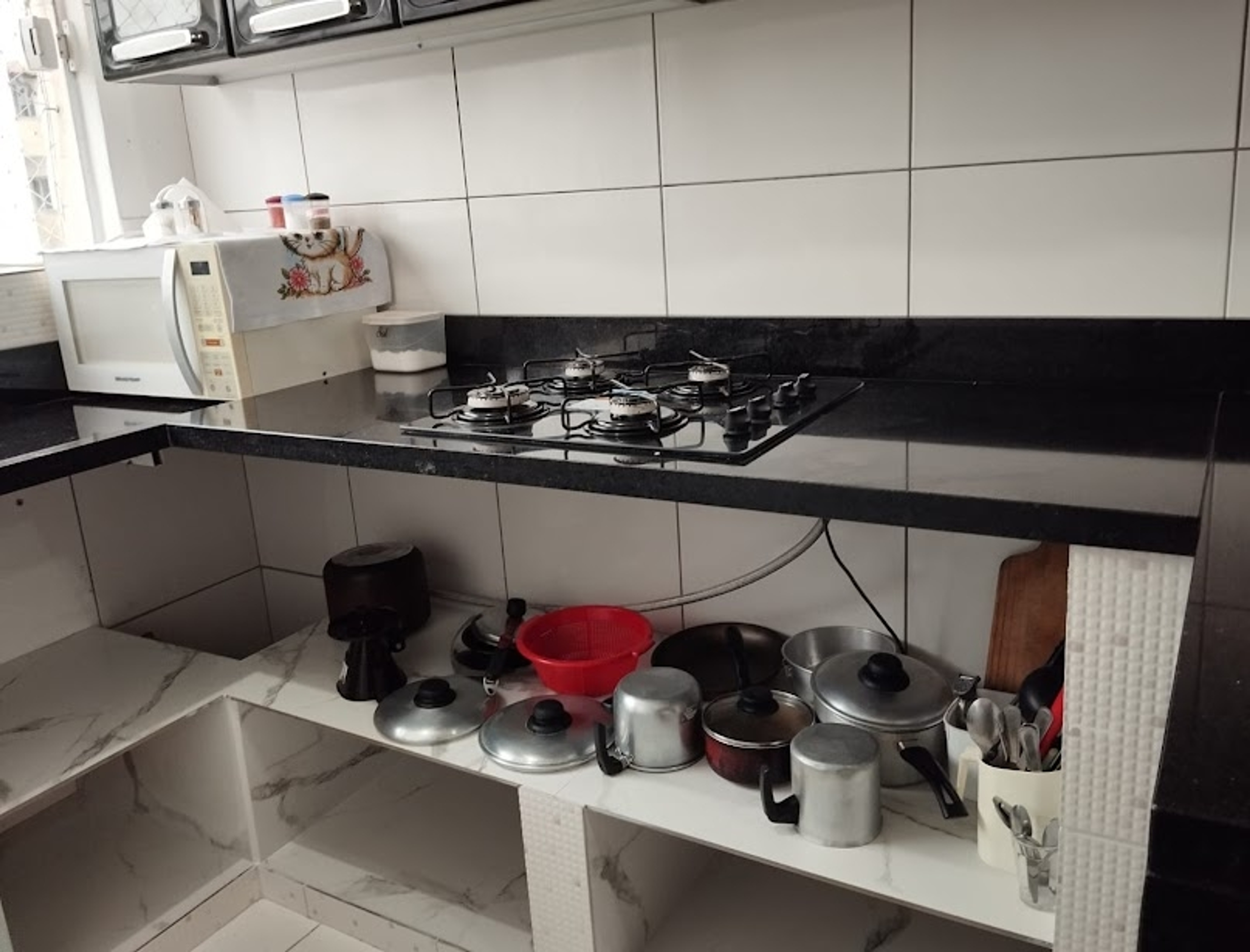 com prateleiras com todos utensílios domésticos, para 18 hóspedes.