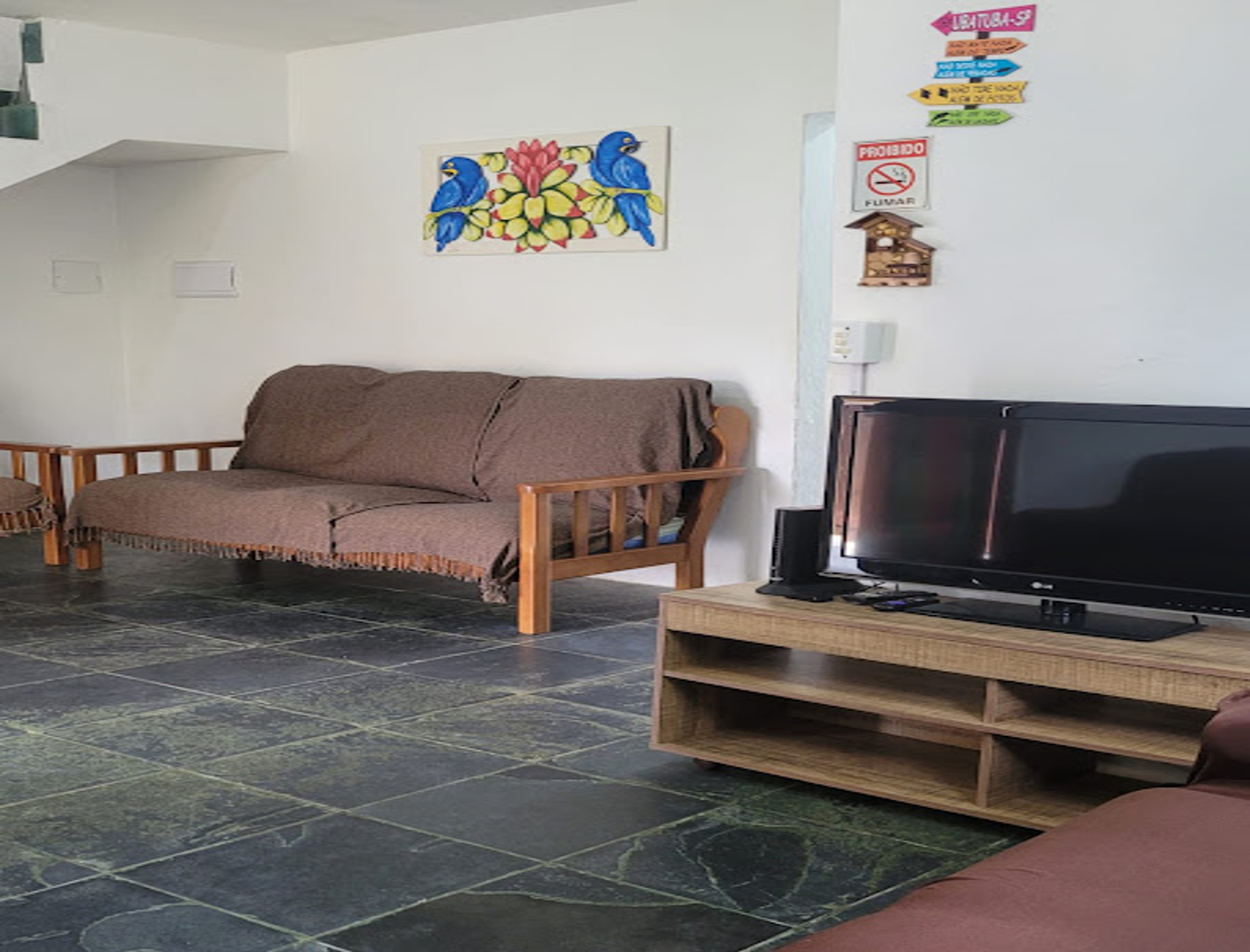 Sala com jogo de sofá e tv, ventiladores de teto.