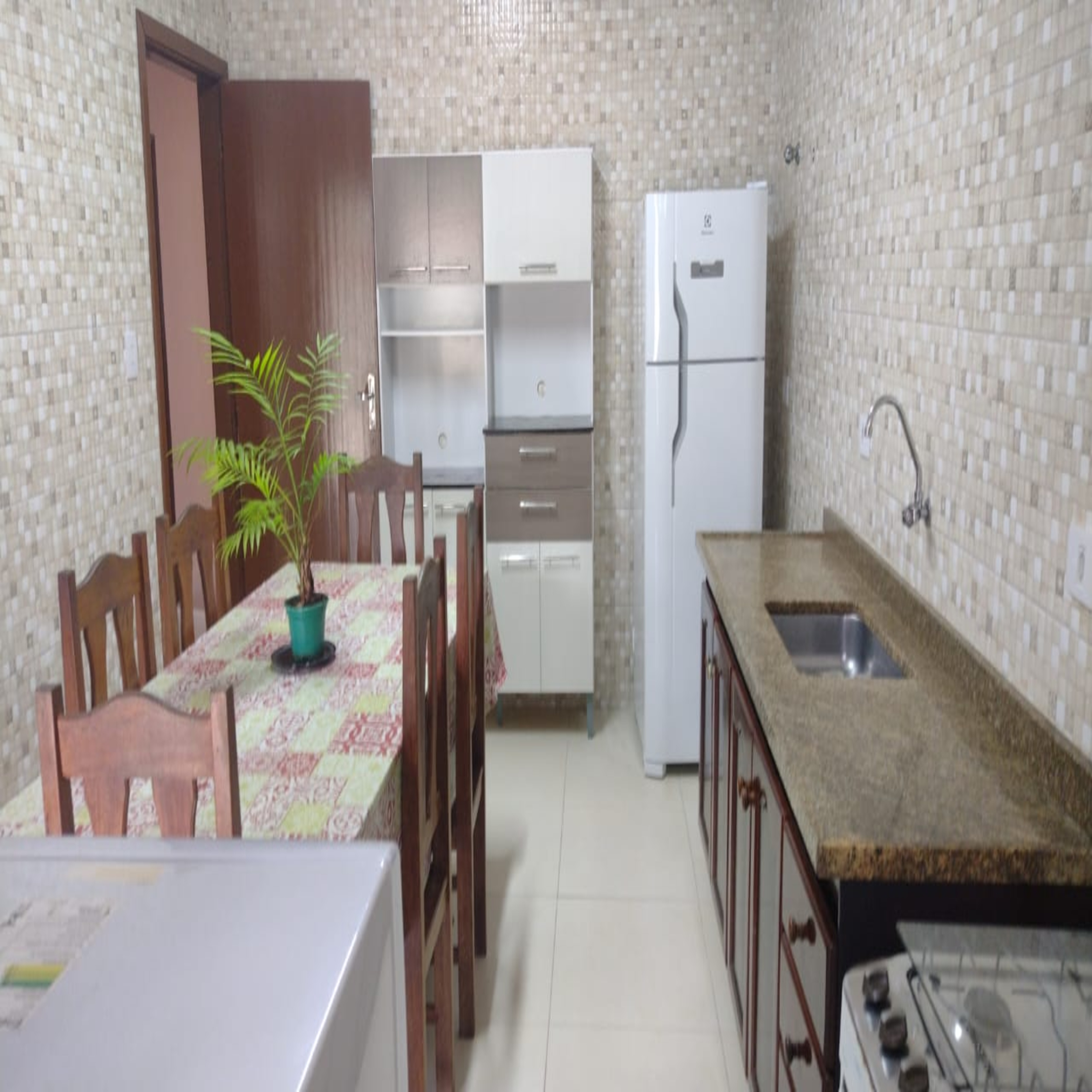 geladeira duplex, mesa grande, fogão 5 bocas, e armários